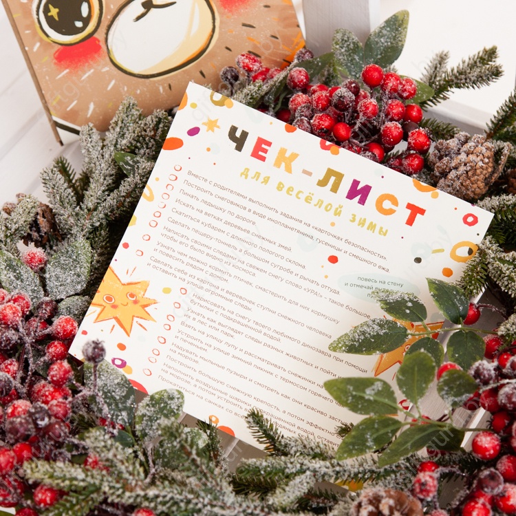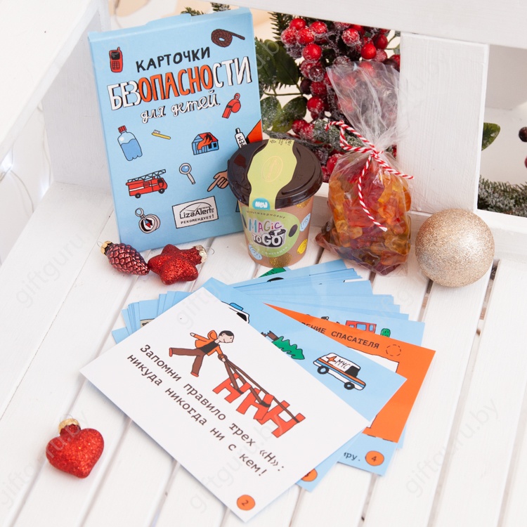 Зима – это время снежков и ледянок, веселья в пушистых сугробах. Чтобы проводить время на улице весело и безопасно, мы добавили в состав подарка многоразовые карточки с заданиями. Они научат детей правильно вести себя в опасных ситуациях. Когда карточки изучены, а светоотражатель крепко держится на куртке, можно приступать к чек-листу веселых зимних забав. Пусть зима не кончается!
