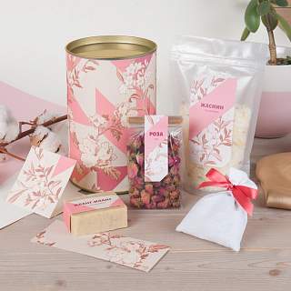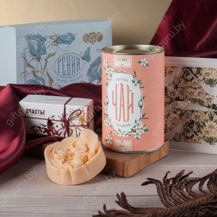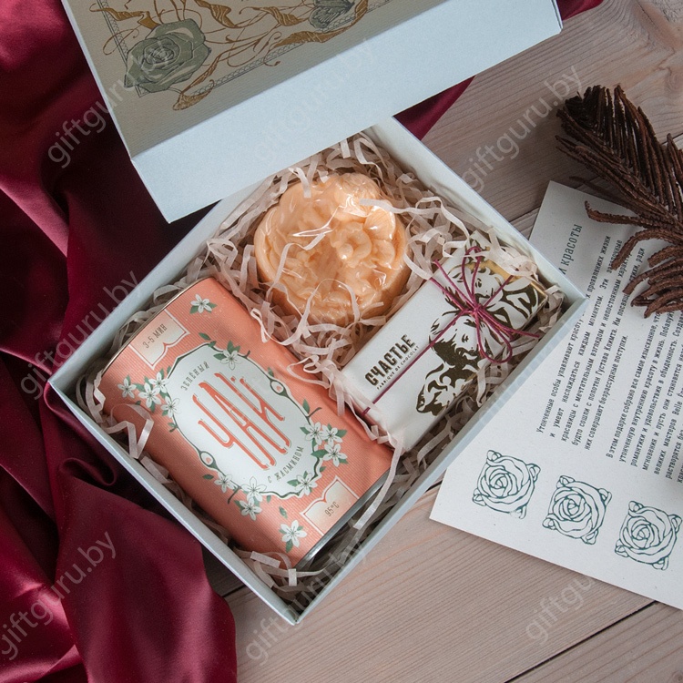 В этот подарок входит зеленый чай с жасмином, упакованный в тубус, две вкуснейшие конфеты «Счастье» и душистое мыло с маленькой феей. Все это упаковано в нежную коробочку, оформленную в духе старинных кондитерских. По запросу состав и дизайн набора можно изменить.