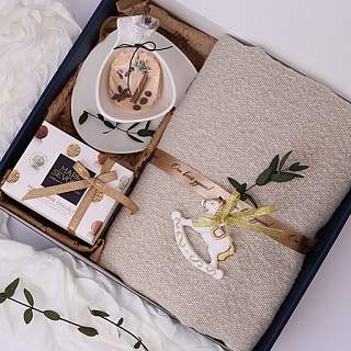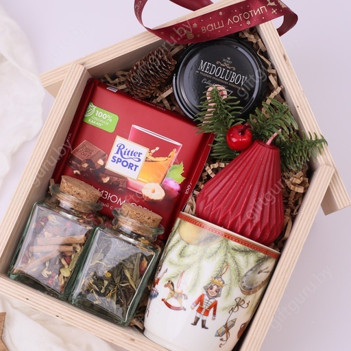 - Коробка «Домик» деревянная с брендированной лентой-ручкой.