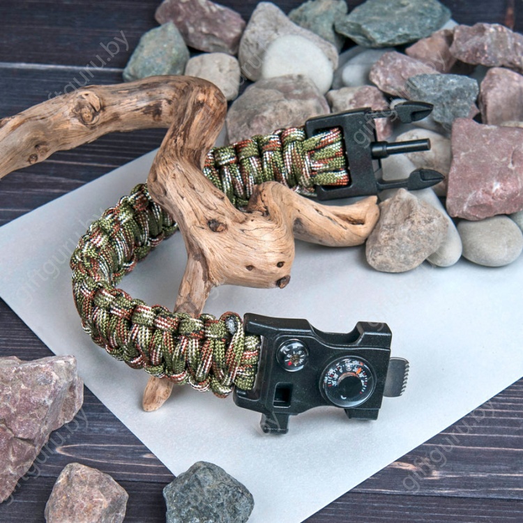 - Браслет из паракорда (огниво, свисток, мини-компас, термометр, клинок серрейтора, мини-отвертки и ключи, паракорд 2,2 м);