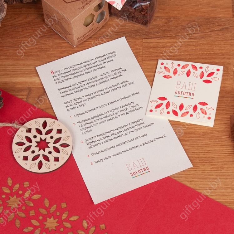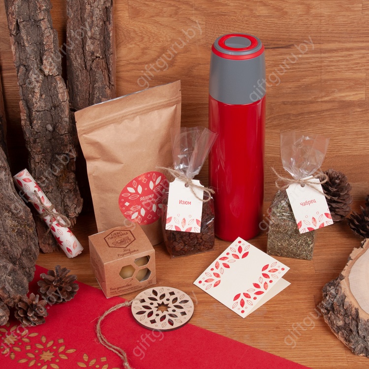 Также подарок дополнен функциональным составляющим - термос, который будет еще долго служить одариваемому, каждый раз напоминая о Вашей заботе , а Новогоднее настроение поддержит игрушка-шар из фанеры.
